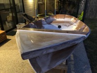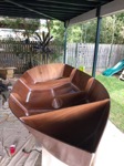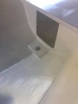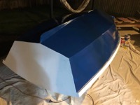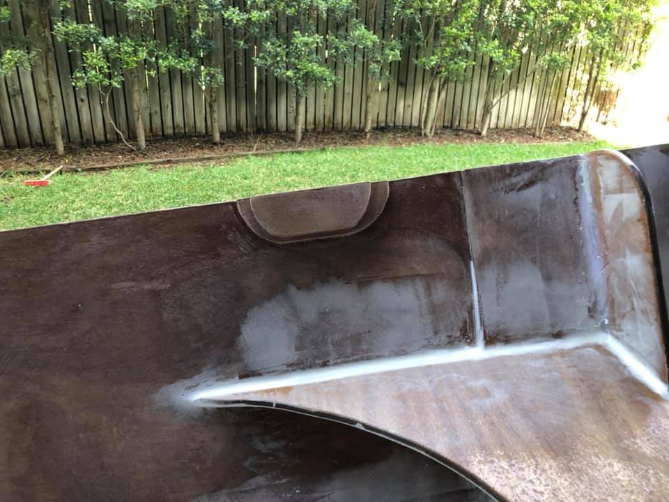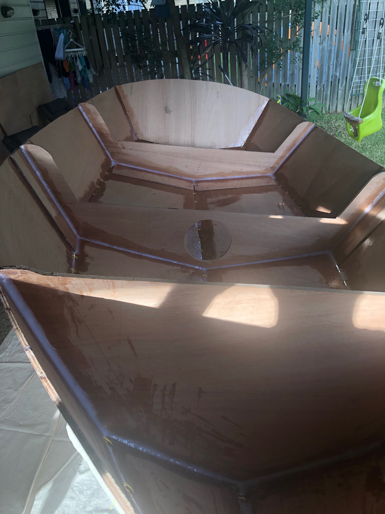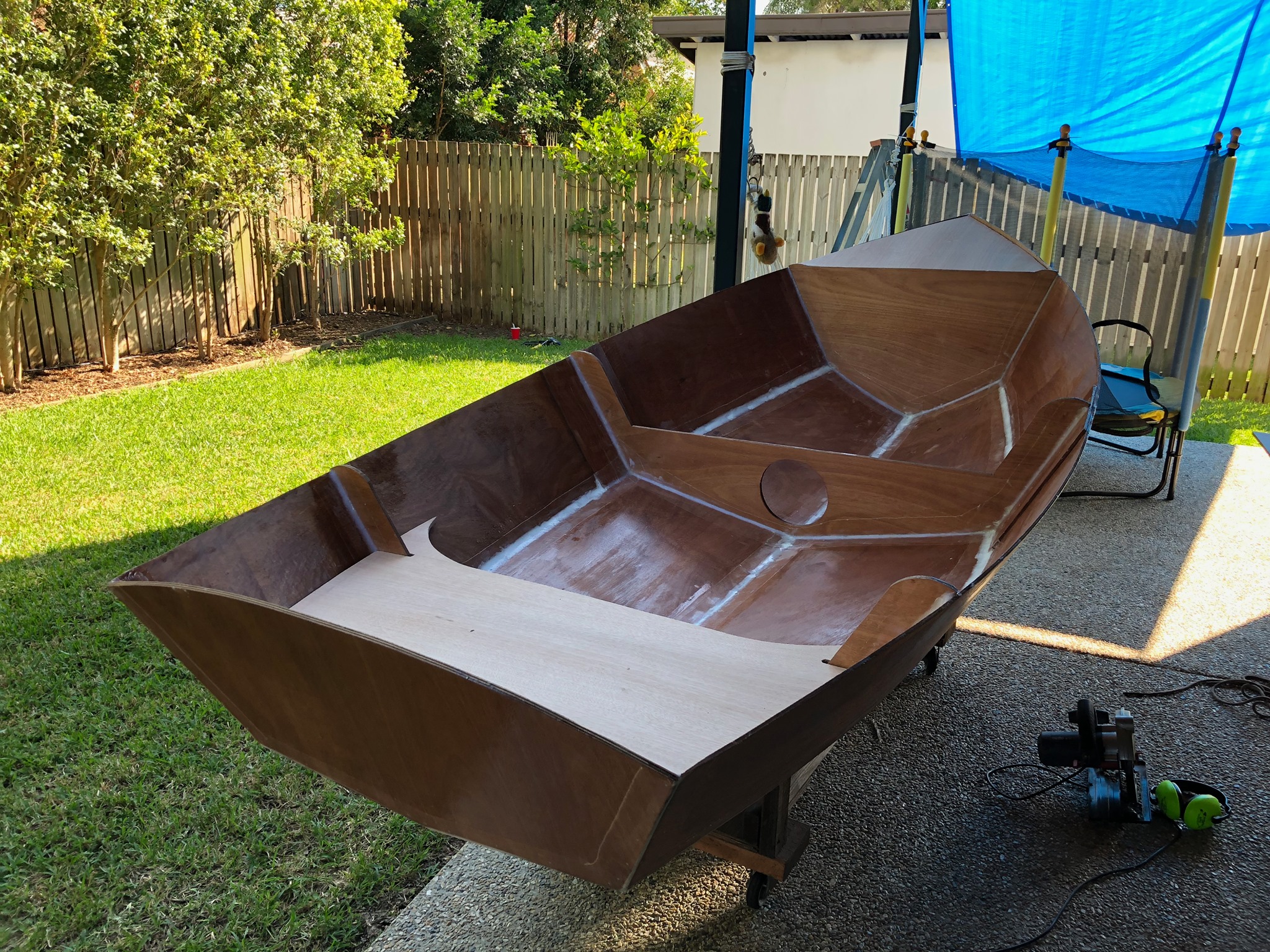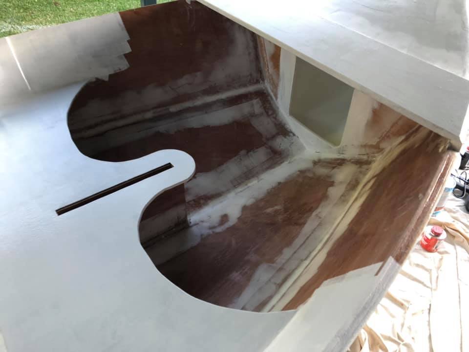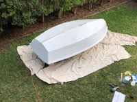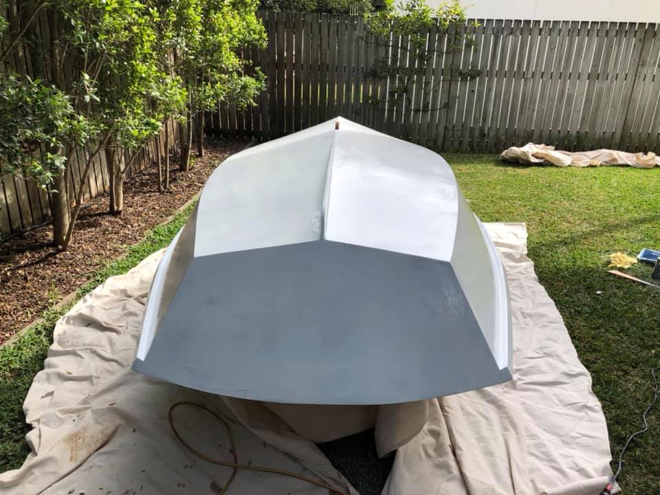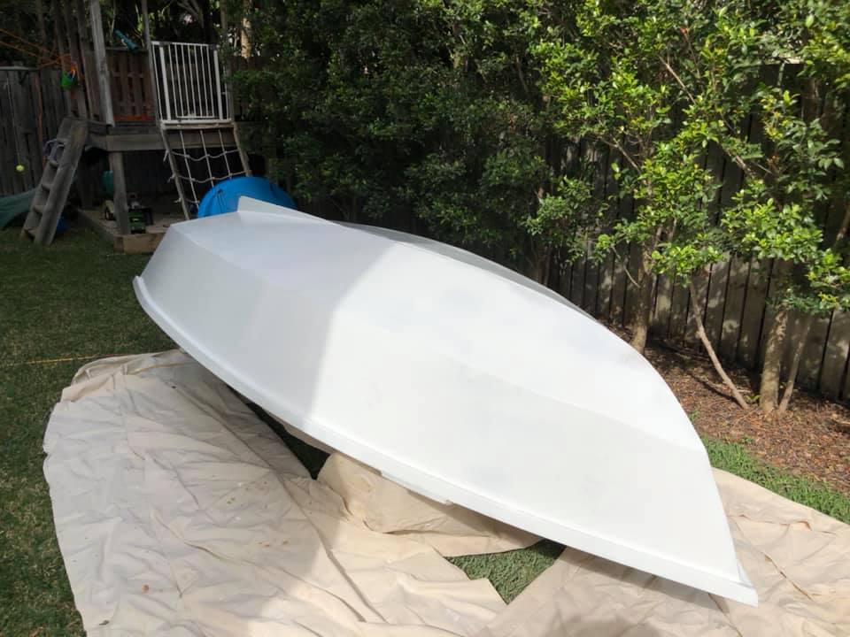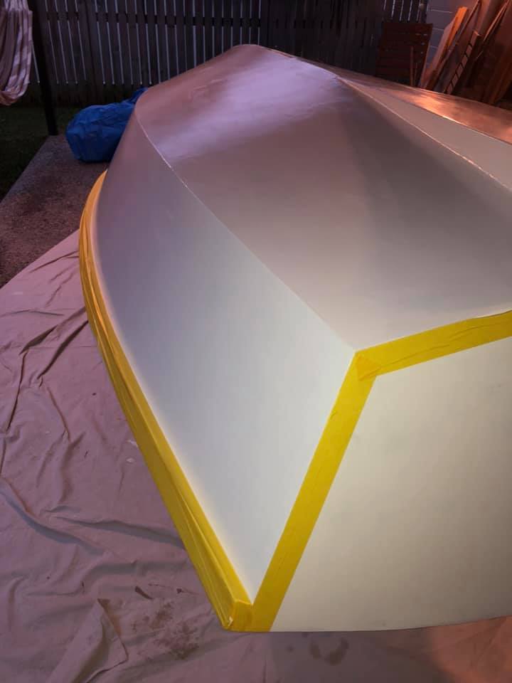 Inside and outside has been faired and sanded (looks messy but is very smooth). Sorry neighbours, I highly recommend Ryobi cordless random orbital sanders.
