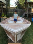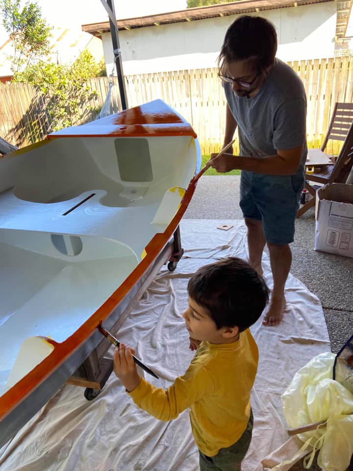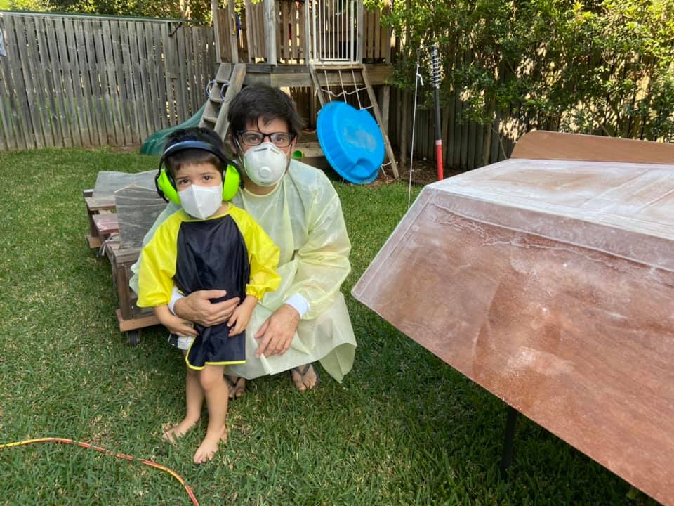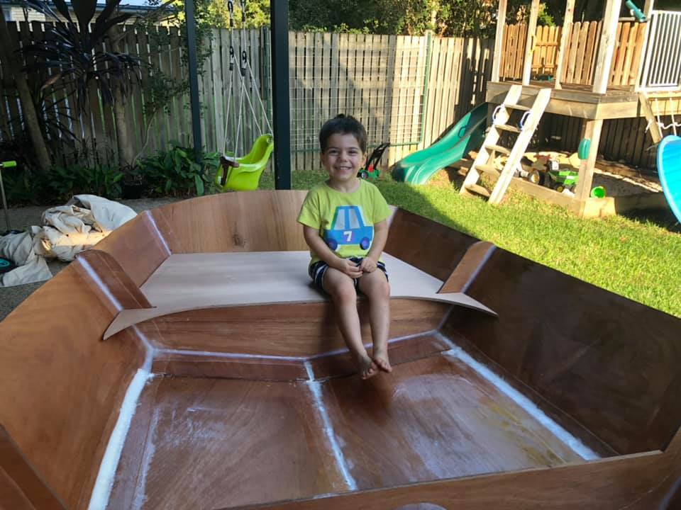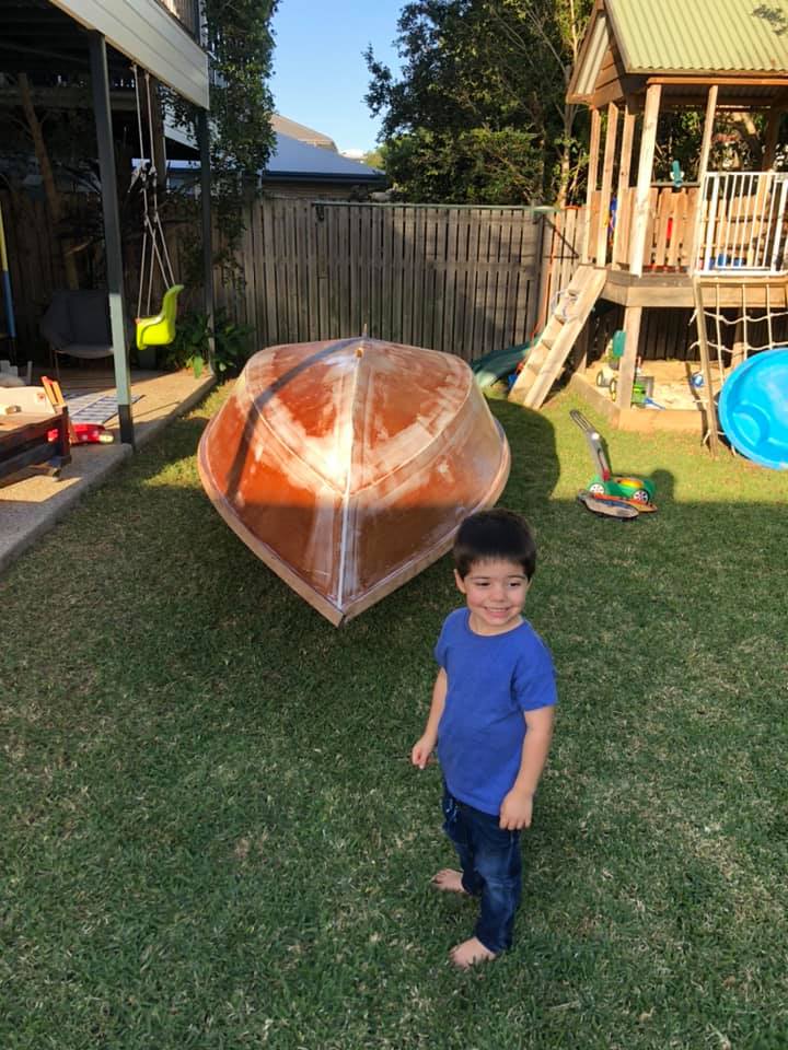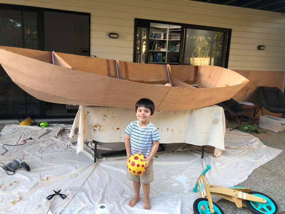 As a third year medical student in 2020, during coronavirus / COVID19 I was suddenly stuck with limited surgery study (only via Zoom) as all elective surgery was suspended. Finding myself with a lot of free time on my hands, I started building a boat with Ian, my three year old son! He was surprisingly helpful, loved drilling holes with me (pulling the trigger as I held the drill), inserting zip-ties, and loved painting.