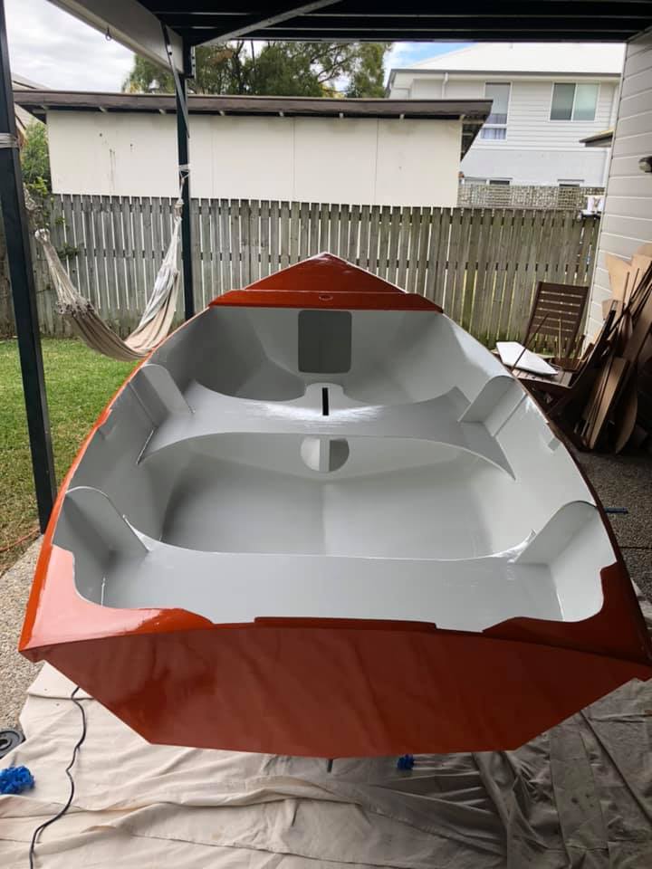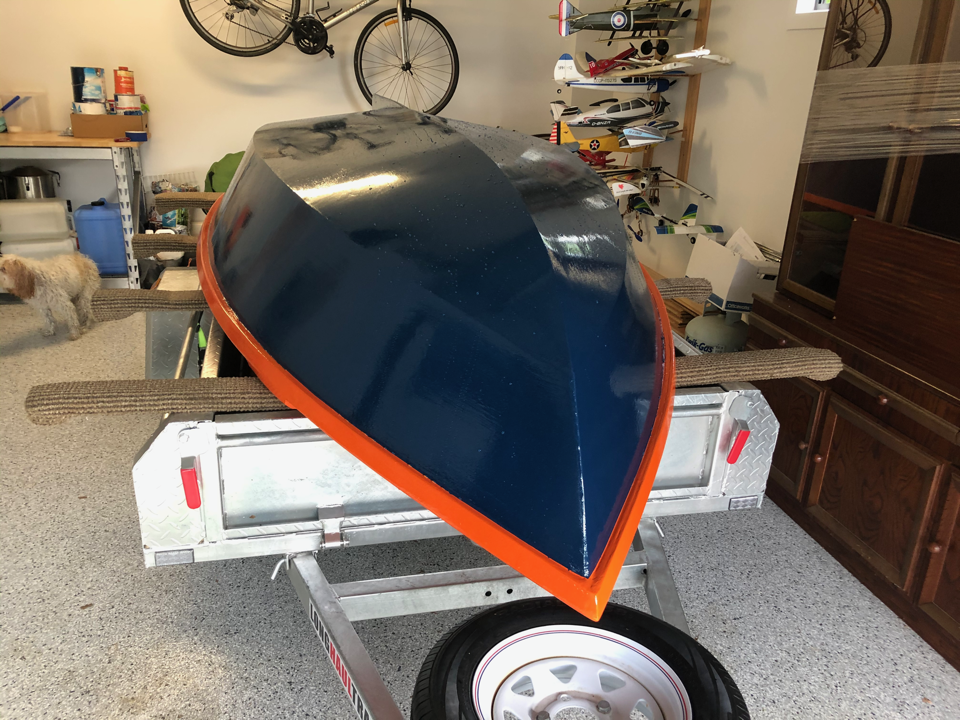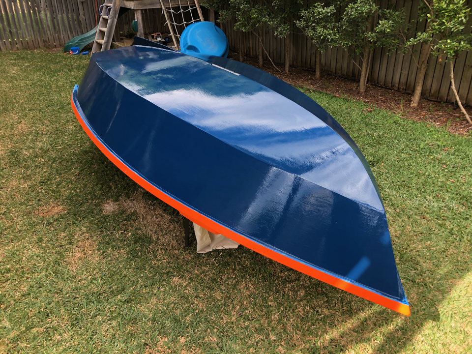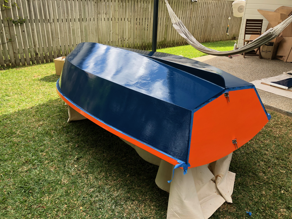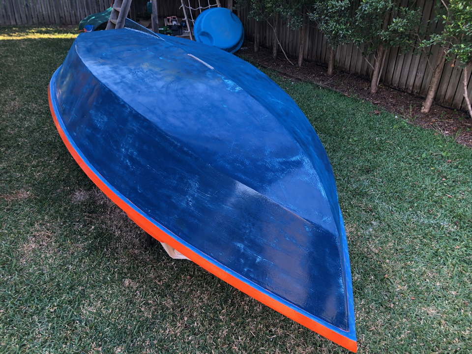 As exams draw near and (more importantly) my boat launch deadline (uni break) draws near, we’re possibly up to the antipenultimate isolation boat post. The second coat of orange paint is down, and the first interior white paint. One more white coat inside to go (with nonslip additive for the floor). Then after that is hardened, we’ll flip it and put the last blue coat on.