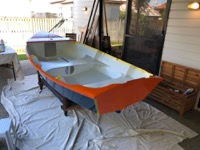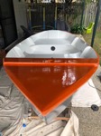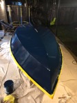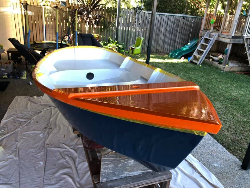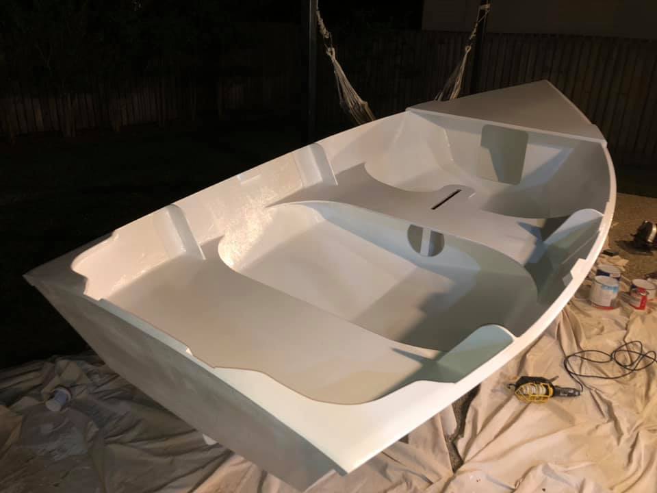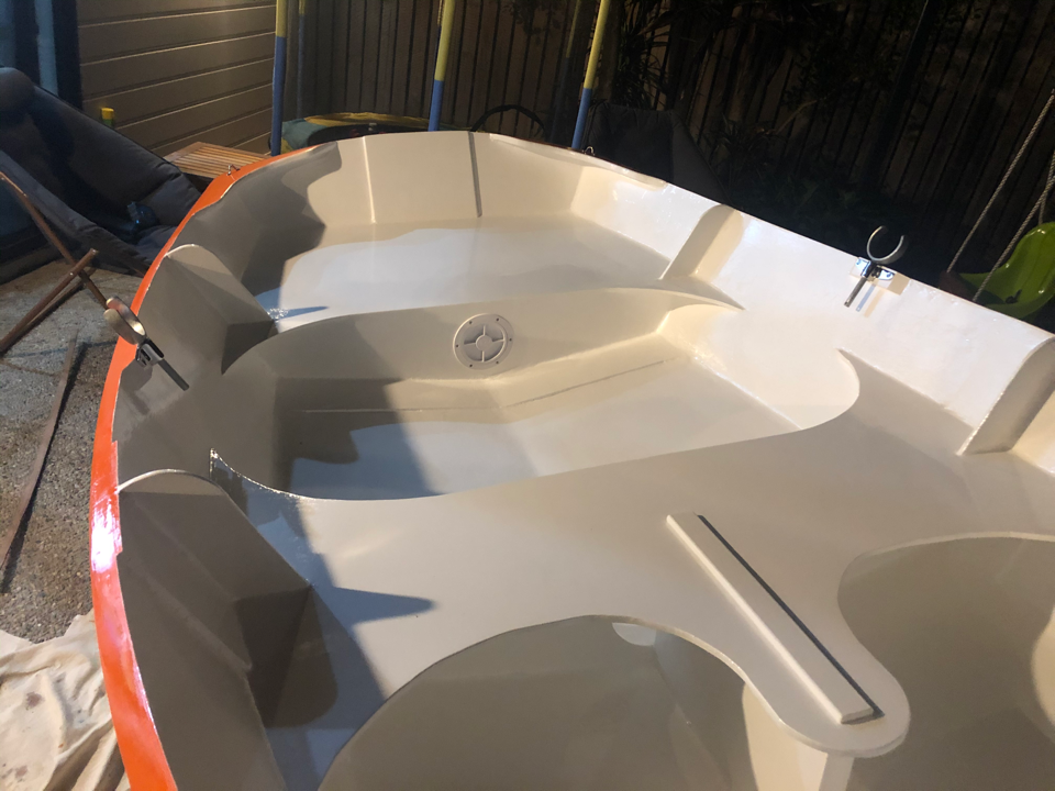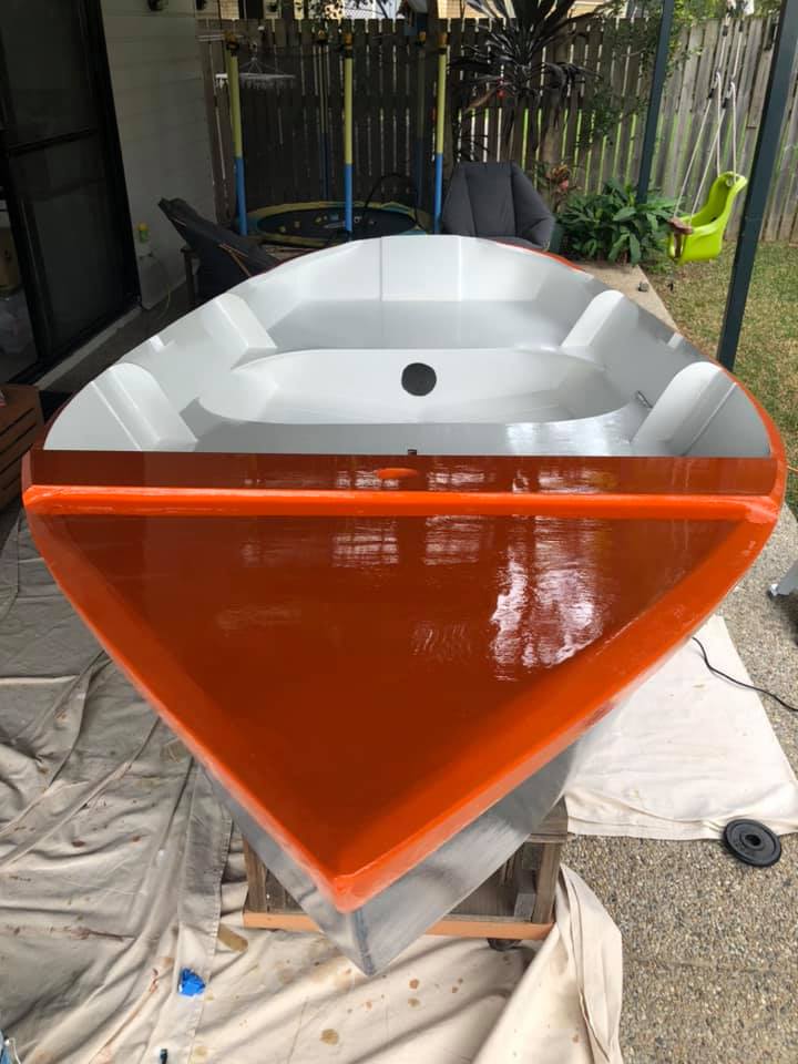 As exams draw near and (more importantly) my boat launch deadline (uni break) draws near, we’re possibly up to the antipenultimate isolation boat post. The second coat of orange paint is down, and the first interior white paint. One more white coat inside to go (with nonslip additive for the floor). Then after that is hardened, we’ll flip it and put the last blue coat on.