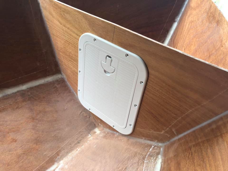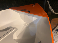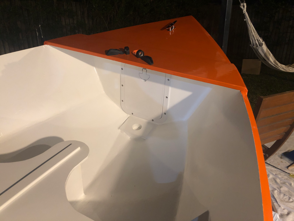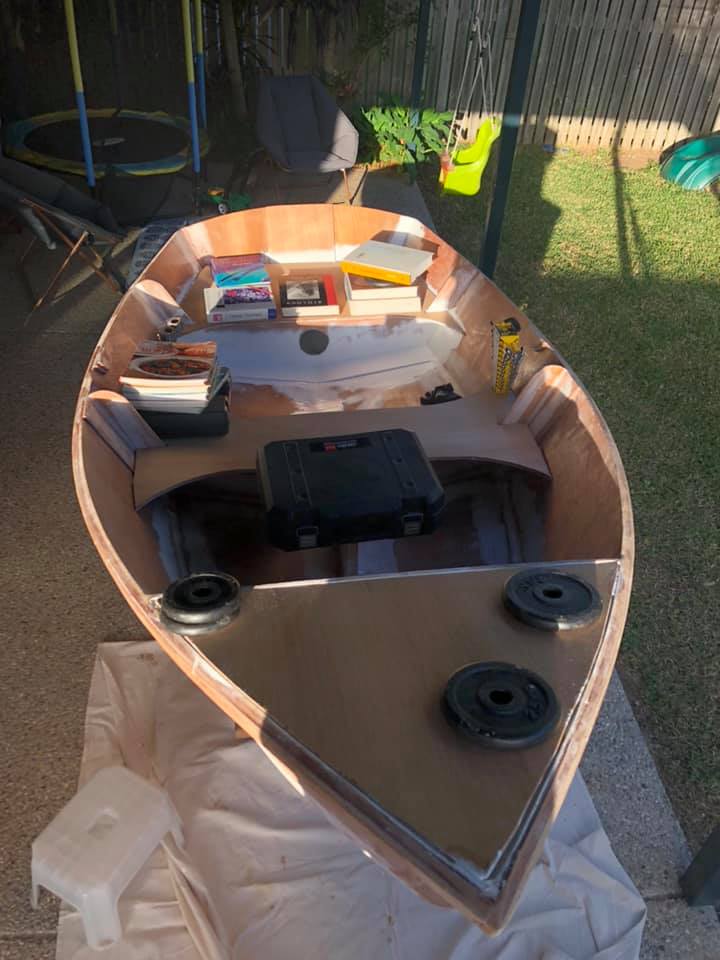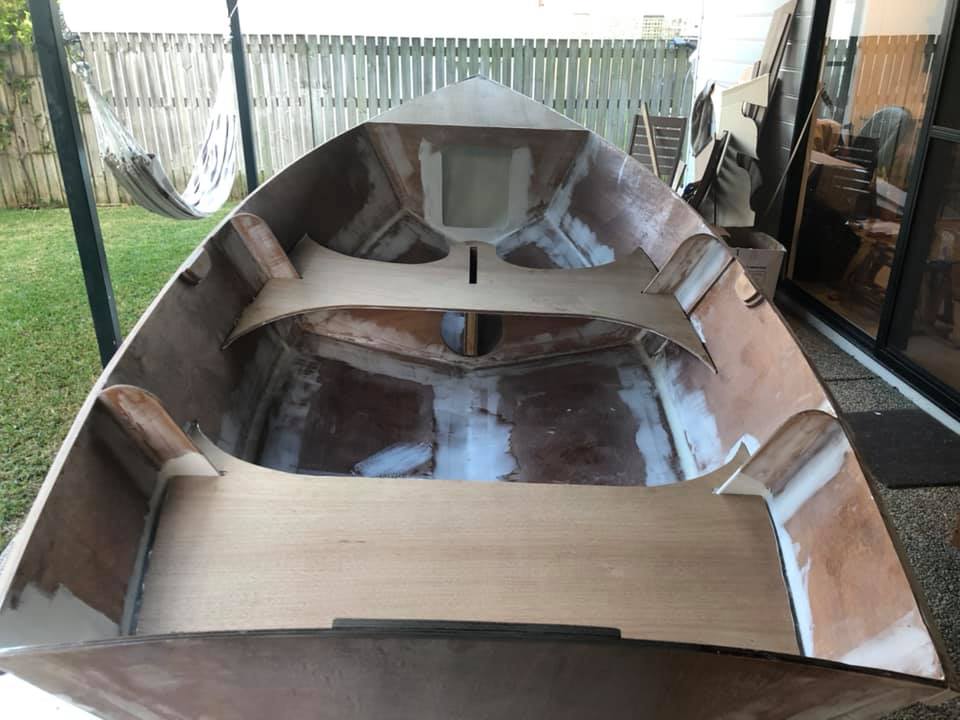 Now onto painting! Seats are finally sorted (see the hole for the daggerboard in the middle seat). I’ve just painted the inside of the buoyancy compartments for now so that I can put on the tops and fibreglass them in.