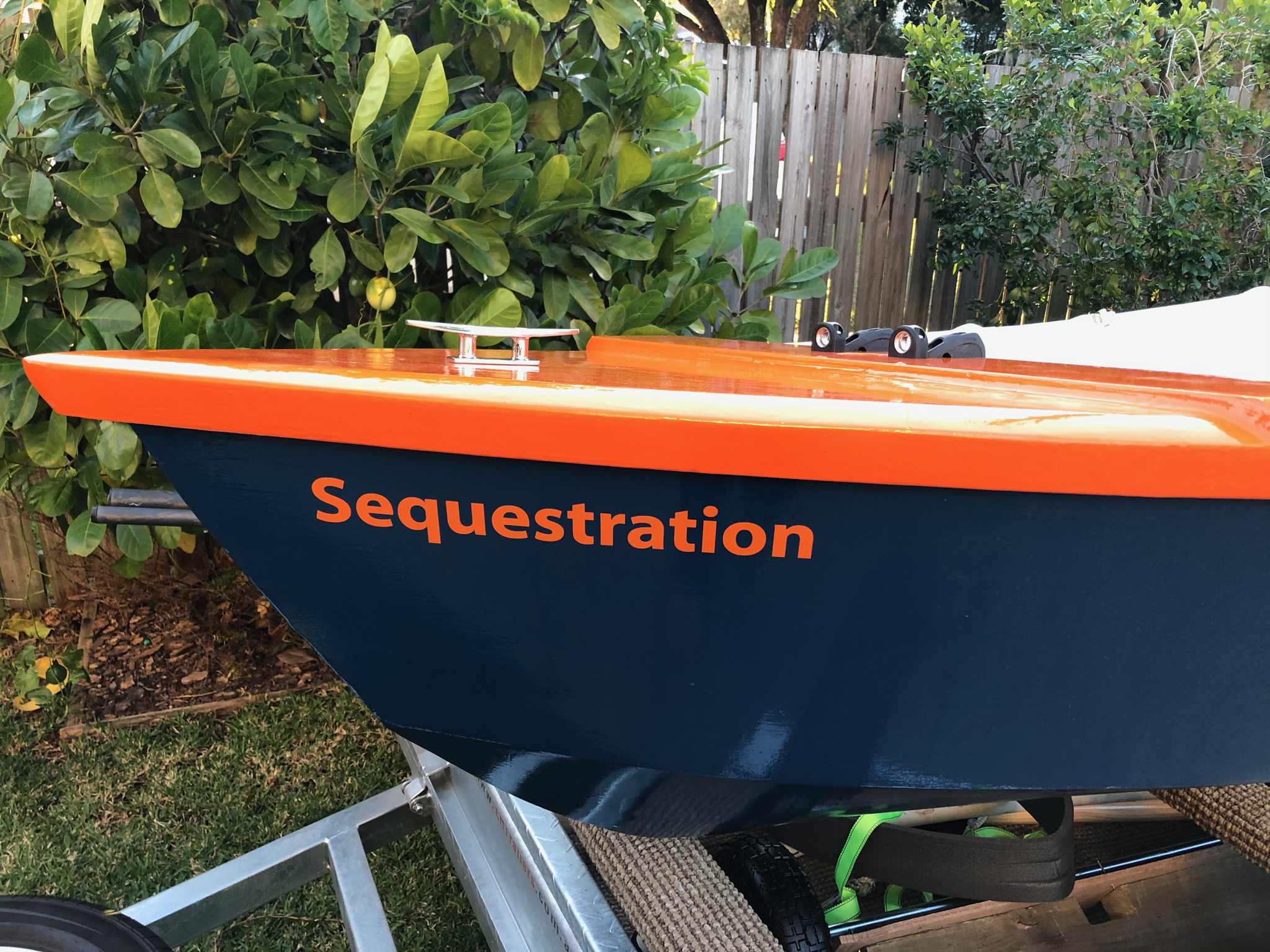 Although we intended to sail with my family, COVID stopped this as I was unable to go and visit them interstate. Instead, we had a family day out on Wivenhoe Dam. We named the boat, "Sequestration". A pun on isolation, and sea quest (yes, groan). $12.85 plus shipping for the name in vinyl stickers.