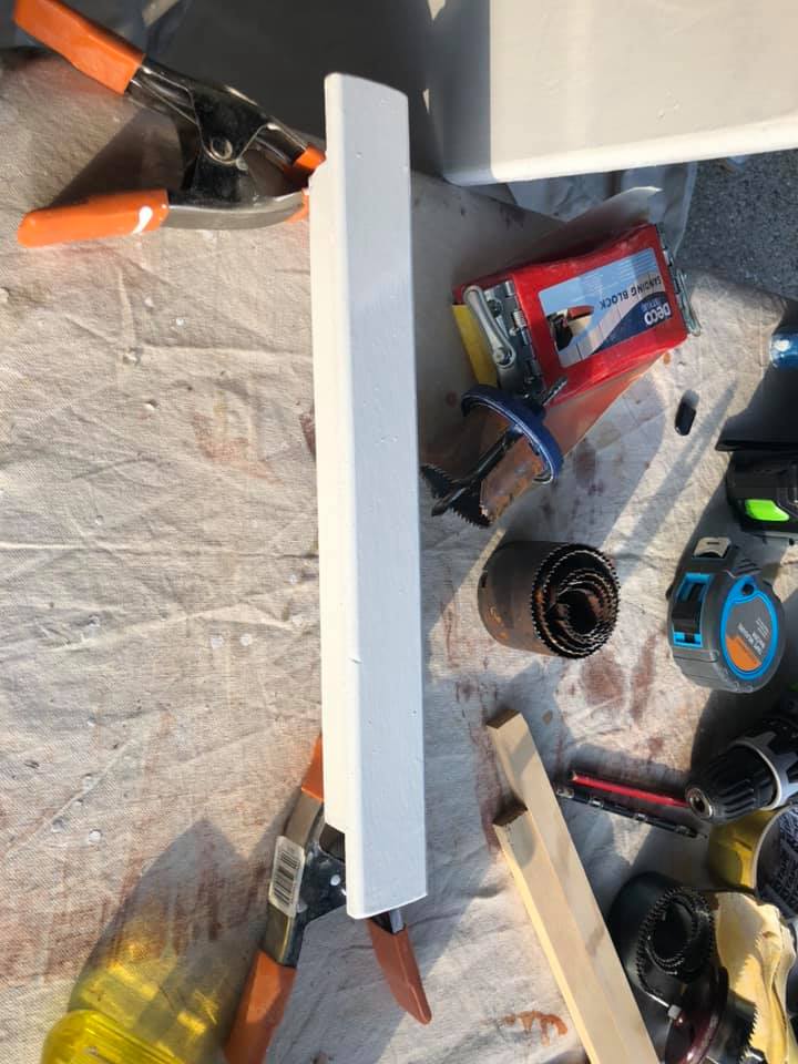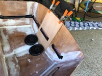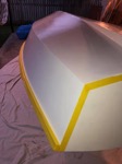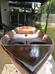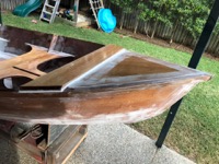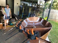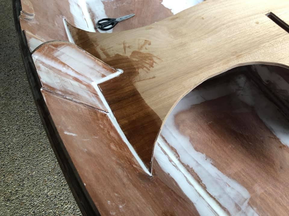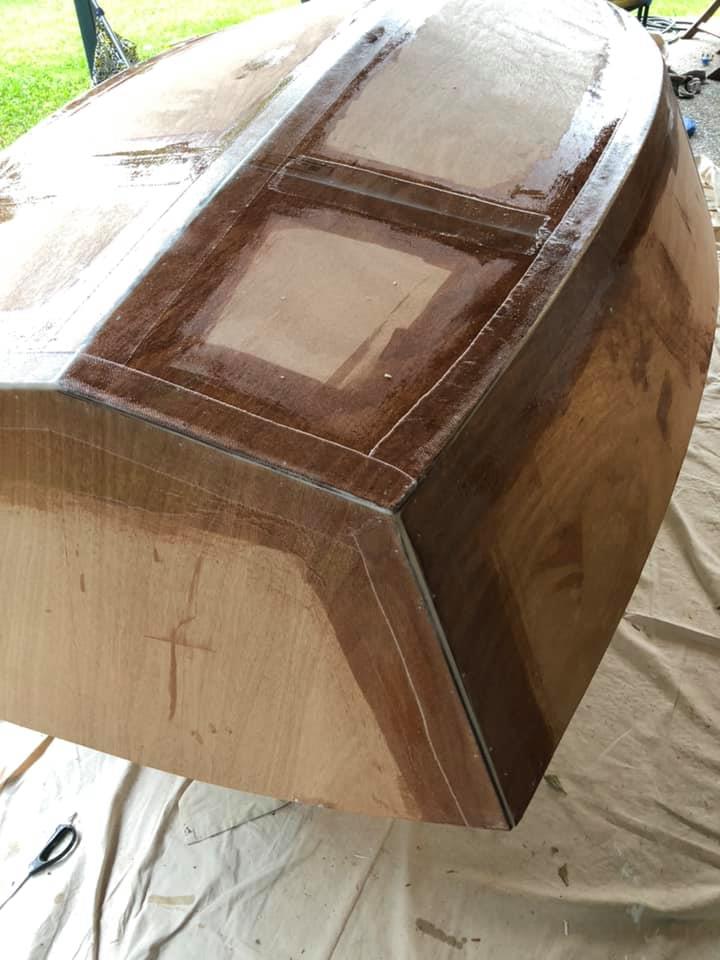 The rubrail/gunwales are now being epoxied on (the other side is tacked in place for symmetry but not shown). Fairing is now going on (white gunk to smooth out fibreglass edges - it’ll be sanded smooth tomorrow).