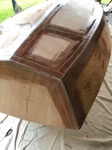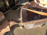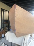 Also, the rubrail has been finished and the prow and transom had a rough shape by hand. Various bits and pieces have been routed to have nice rounded edges, and the top of the sides has had the ply routed flush with the rubrail using a flush bit.