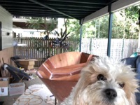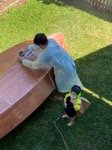 Isla is pleased with the boat progress. Bottom seams are all filled and fibreglassed, and the bottom hull sealed with epoxy. Next step will be to coat the inside and measure up for the seats, daggerboard case and front deck. Fiberglass tape is going on - goes surprisingly transparent (from white) if you’ve never seen it used before.